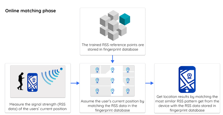 The online matching phase measures the RSSIs from beacons and compares them with the values stored in the database to infer a location. The Received Signal Strength (RSS) value obtained at any point in a location is called a location fingerprint.