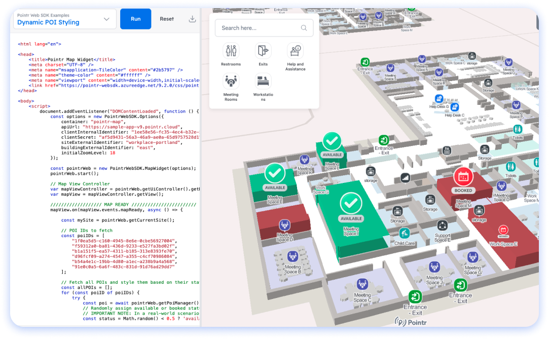 Operations and experience managers can reflect real-world conditions instantly, from meeting room or desk availability to hiding restricted areas or highlighting live events, all managed directly through the SDK.